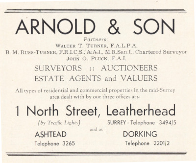 North Street Kelly's 1950 Arnold & Son, estate agents LUDC 1965/67 Arnold & Son Chartered Surveyors, Valuers Auctioneers and Estate Agents Established 1855 BM Russ-Turner FRICS FAI MRSanI SF Bolton FRICS FAI also 23 The Street Ashtead |