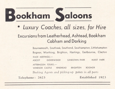 Road Kelly's 1950 Bookham Saloon Transport Services Ltd. motor coach proprs LUDC 1950 Bookham Saloons Luxury Coaches, all sizes, for Hire Excursions from Leatherhead, Ashtead, Bookham, Cobham and Dorking Bournemouth, Southsea, Southend, Southampton, Littlehampton Bognor, Worthing, Brighton, Hastings, Eastbourne, Clacton Race Meetings - Ascot, Goodwood, Sandown Park, Hurst Park Afternoon Tours - Windsor Castle, Hindhead, Brighton, Bognor Booking Agents and picking up points in all parts Telephone 2623 Established 1923 |