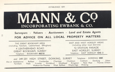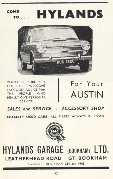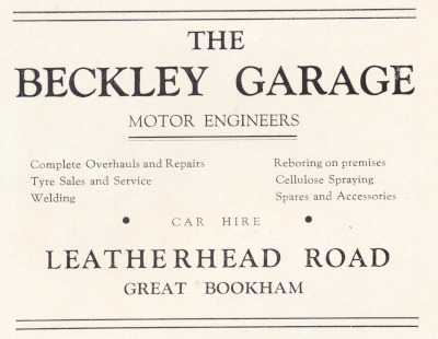 Road Kelly's 1950 Beckley Garage (C. A. Whiteman, propr.), motor garage LUDC 1950 The Beckley Garage Motor Engineers, Car Hire Complete Overhauls and Repairs, Reboring on premises, Tyre Sales and Service, Cellulose Spraying, Welding, Spares and Accessories Car Hire Leatherhead Road, Great Bookham |