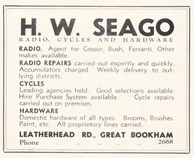 Road Kelly's, 1950 Seago Hy. Wm. hardware dlr LUDC 1950 HW Seago Radio, Cycles and Hardware Radio - Agent for Cossor, Bush, Ferranti, Other makes available Radio Repairs - carried out expertly and quickly. Accumulators charged. Weekly delivery to outlying districts Cycles - Leading agencies held. Good selections available. Hire Purchase System available. Cycle repairs carried out on premises. Hardware - Domestic hardware of all types. Brooms, Brushes, Paint etc. All proprietory lines carried. Leatherhead Road, Great Bookham |