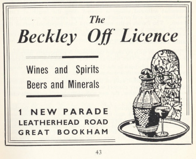 Parade, Leatherhead Road Kelly's 1950 Beckley Off Licence (Mrs. D. I. Wootten, proprietress) 1 New Parade, Leatherhead Road, Great Bookham LUDC 1965/67 The Beckley Off Licence Wines and Spirits Beers and Minerals |