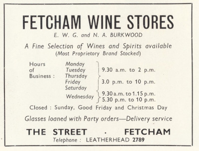 The Street Kelly's 1950 Fetcham Wine Stores (Edwd Burkwood), wine &spirit mers LUDC 1950 Fetcham Wine Stores Proprietor EWG Burkwood Wine and Spirits, Bottled Beers, Minerals Prompt Delivery Service LUDC 1965/67 Fetcham Wine Stores Proprietor EWG and NA Burkwood A Fine Selection of Wines and Spirits available (Most Proprietory Brand Stocked) Hours of Business MTThFS: 9.30am to 2pm, 3pm to 10pm W: 9.30am to 1.15pm, 5.30pm to 10pm Closed: Sunday, Good Friday and Christmas Day Glasses loaned with Party orders The Street, Fetcham |