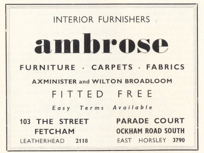 The Street LUDC 1965/67 Interior Furnishers Ambrose Furniture, Carpets, Fabrics Axminster and Wilton Broadloom Fitted Free Easy Terms Available 103 The Street, Fetcham Parade Court, Ockham Road South |